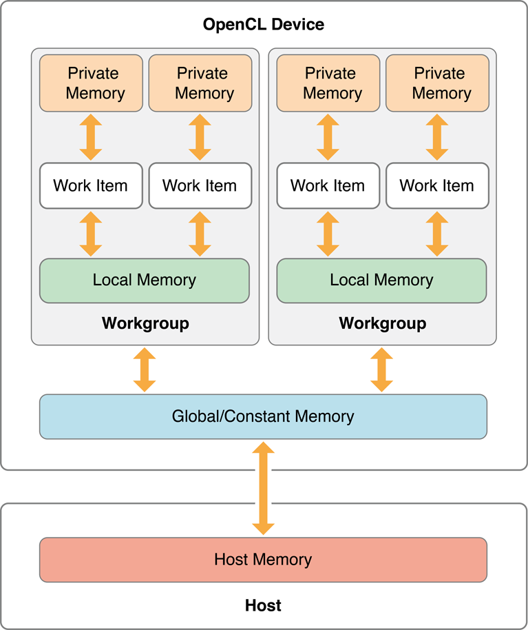 In other words, even if host and OpenCL memory are physically contiguous, host memory is distinct from OpenCL memory. Kernels can only access data in the memory of OpenCL devices. The host computer can read and write to device memory, but only to set it up and retrieve results. During computation, a device looks only in device memory, and the host stays out of its way.