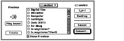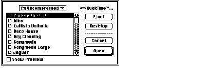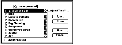 The SFGetFilePreview, SFPGetFilePreview, StandardGetFilePreview, and CustomGetFilePreview functions allow the user to automatically convert files to movies if your application requests movies. If there is a file that can be converted into a movie file using a movie import component, then the file is shown in the Standard File dialog box in addition to any movies. When the user selects the file, the Open button changes to a Convert button. Figure 8-6 provides an example of this dialog box.