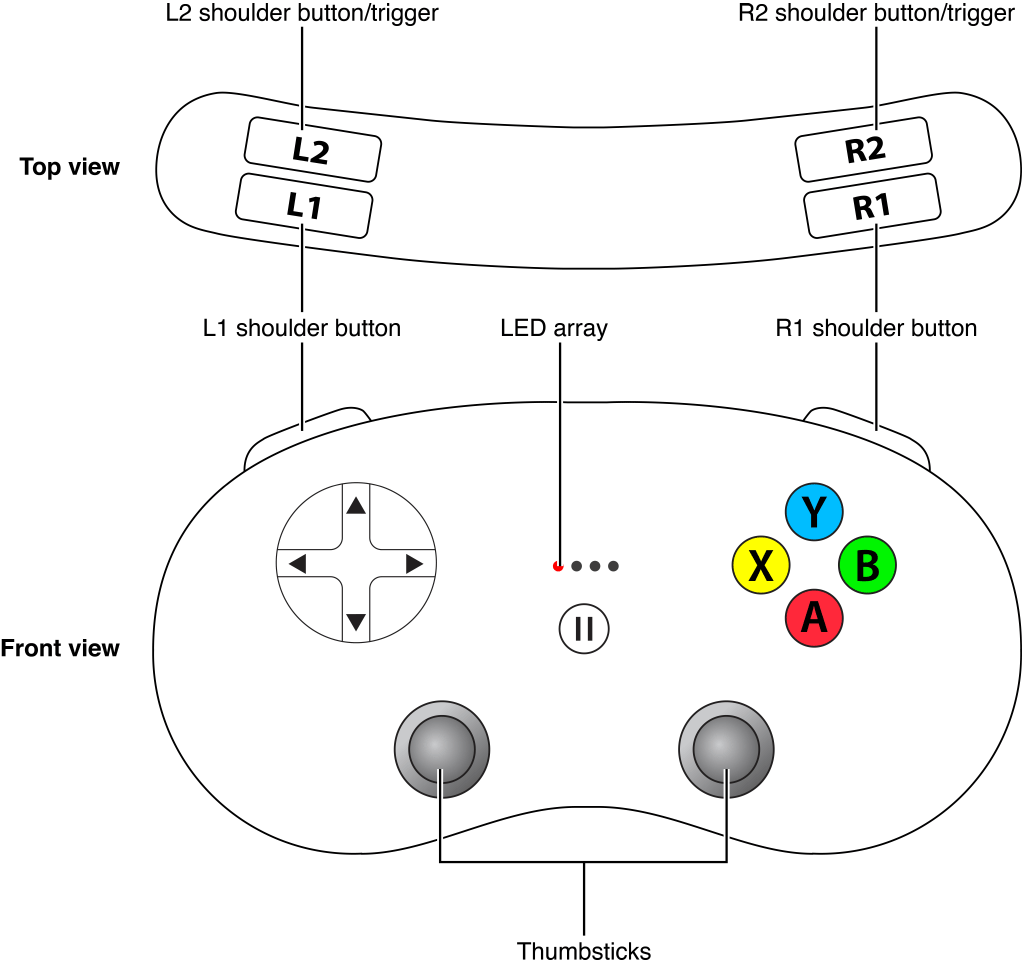 As you implement controller support in your game, make sure you describe those controls to the player. A player should always be able to learn what a control is used for. For example, you might want to implement a tutorial to teach players how to play your game, or you might include a screen of content that describes the controls. Every controller has consistent labeling based on the control layout. Use this terminology consistently to refer to the controls so that players always see the same control names regardless of the game they are playing.