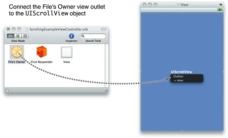 To create a scroll view in Interface Builder, you drag the UIScrollView icon located in the Library->Cocoa Touch->Data Views section of the Library palette into the view ‘window’. You then connect the UIViewController subclass’s view outlet to the scroll view. Figure 1-1 shows the connection, assuming that the File’s Owner is the UIViewController subclass (a common design pattern).