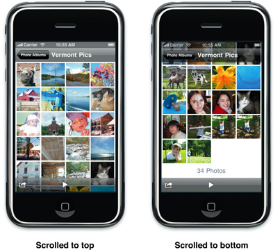 This code creates a scroll view that is the size of the full screen (less the status bar), sets the scrollView object as the controller’s view, and sets the contentSize property to 320 x 758 pixels. This code creates a scroll view that will scroll vertically.