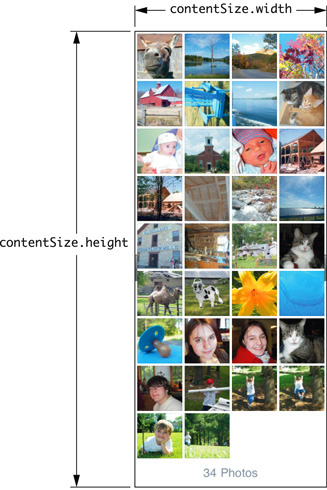 The contentSize property is the size of the content that you need to display in the scroll view. In Creating Scroll Views in Interface Builder, it is set to 320 wide by 758 pixels high. The image in Figure 1-2 shows the content of the scroll view with the contentSize width and height indicated.