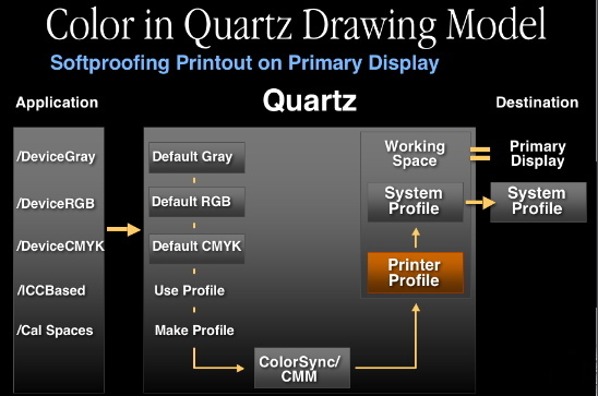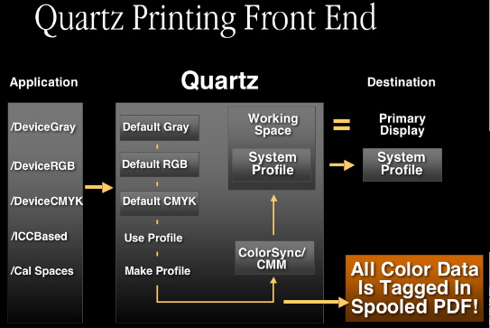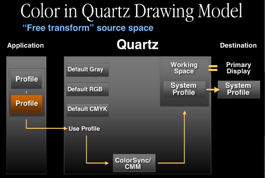 In terms of color processing, the application can request Quartz to render data in any of the PDF color spaces. To accomplish that, Quartz will convert all these into ICC profiles. Default profiles are selected by Quartz, but can be overridden by the application. Quartz will do all compositing in the working space, and ColorSync will be invoked to perform color transformations from any of the source color spaces to the working space. Finally, when compositing is completed, the rasterized data will be sent to the desired destination. Naturally, if the color space of the destination doesn't match the working space, and additional conversion must be done.