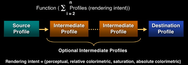 ICC color conversions are very similar to those in PDF. The differences are an option to insert an intermediate profile between the source and destination profiles: