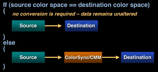 Another simple but very important concept that Quartz inherited from PDF is color space equivalence. An implied rule is that color conversions are necessary only if the source color space is different from the destination. Quartz takes advantage of this simple rule to properly organize the flow of color data through multiple rendering stages: