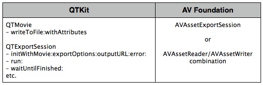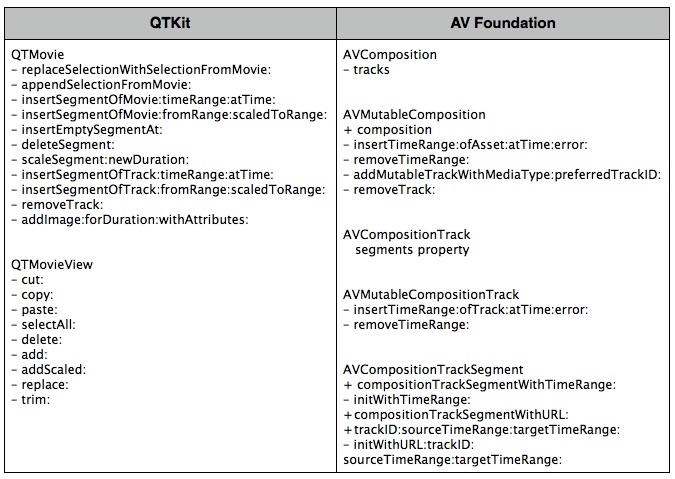 AV Foundation is the recommended framework for all new development involving time-based audiovisual media on iOS and OS X. AV Foundation is also recommended for transitioning existing apps based on QTKit. Introduced in OS X 10.4, QTKit provides a set of Objective-C classes and methods designed to handle the basic tasks of playback, editing, export, audio/video capture and recording, in addition to a number of other multimedia capabilities.