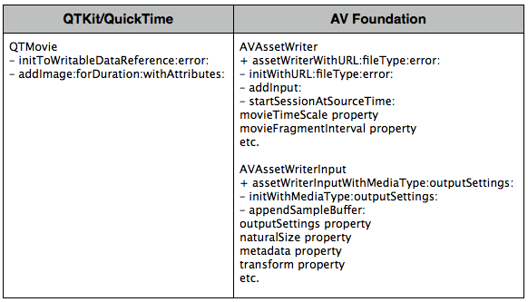 Figure 7  Writing Media using QTKit and AV Foundation.