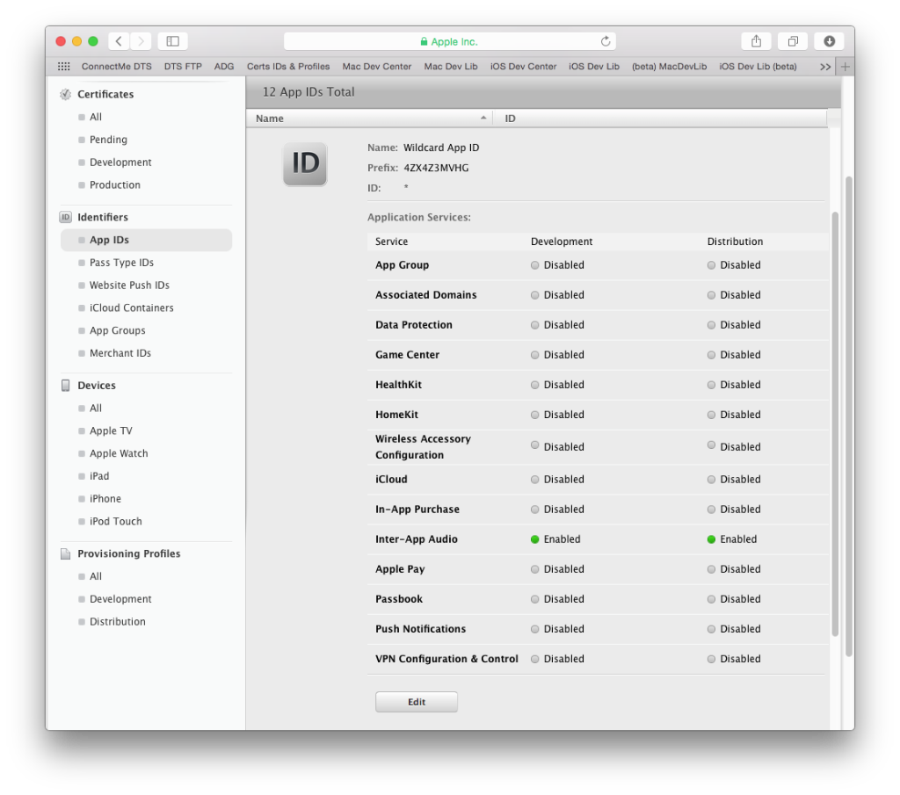 Figure 4  An App ID's enabled services on Certificates, IDs & Profiles.