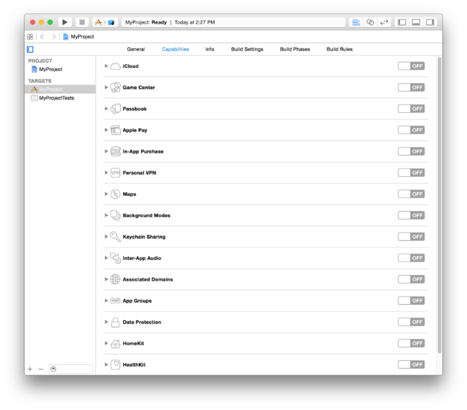• Certain capabilities require a code signing entitlements file. Xcode manages the creation of this file automatically when you adjust a target's capabilities.